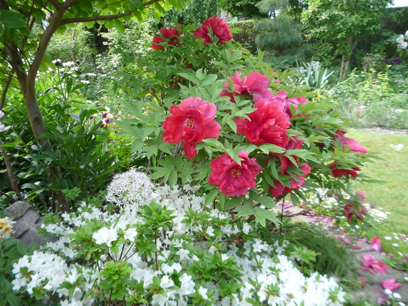 W ogrodzie nowa piwonia zakwitła dwoma kwiatami jest śliczna .