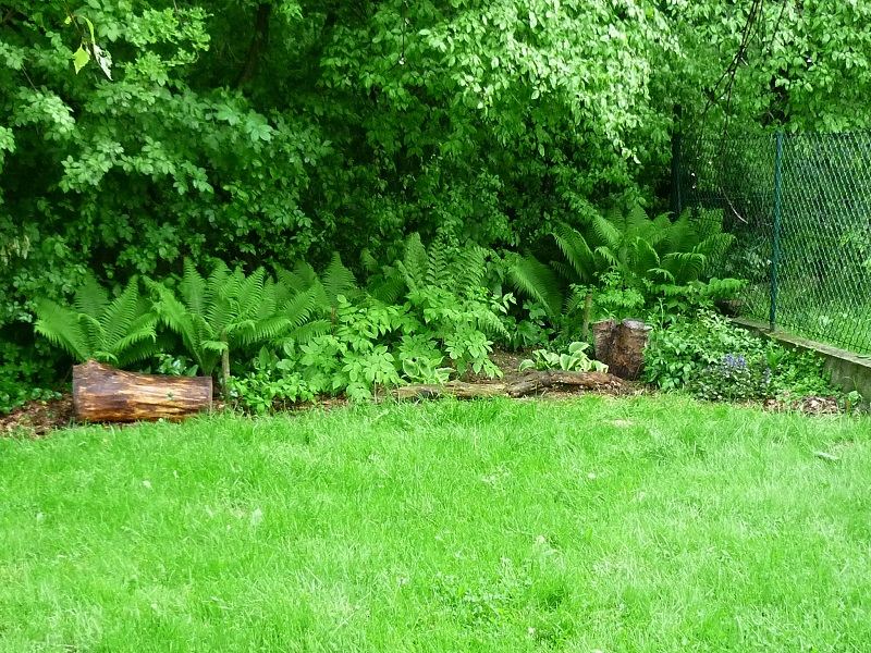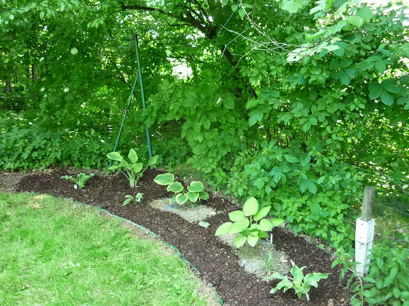 Na początku był, hmmmmm, powiedzmy, naturalny żywopłot z podagrycznika. Zaczęłam wyrywać kawałek po kawałku i tak zrobiło się miejsce na dwie podarowane hosty i trzy parzydła leśne.