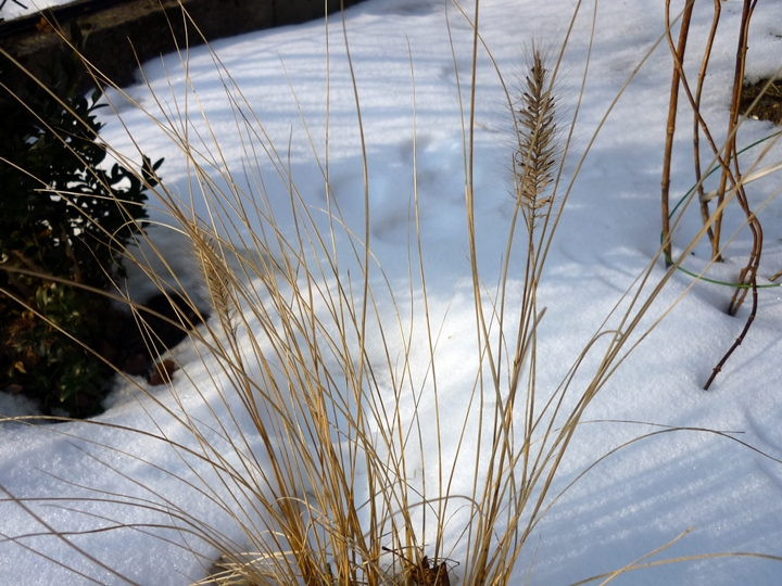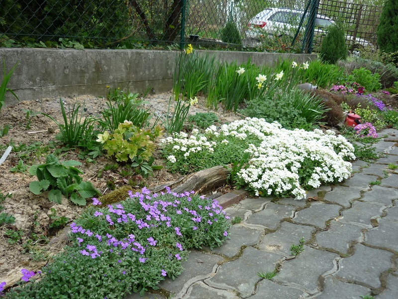 Kwiecień - już widać roślinki, które wpychają się również na chodnik. Kwitną żagwiny, gęsiówka kaukaska, żonkile, pierwiosnki, ciemiernik biały.