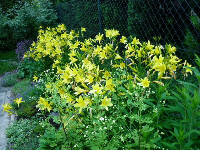 Maj - liliowce żółte, śniedki, irysy kłączowe fioletowe, kocimiętka fassena, zaczyna kwitnąć kuklik.