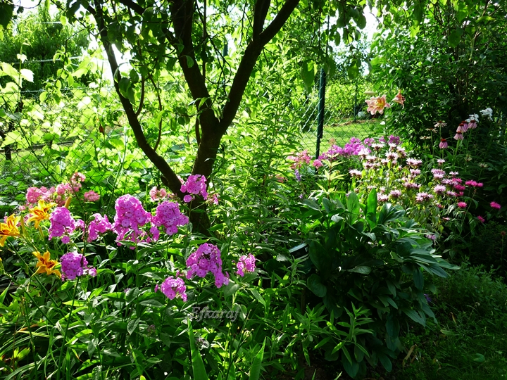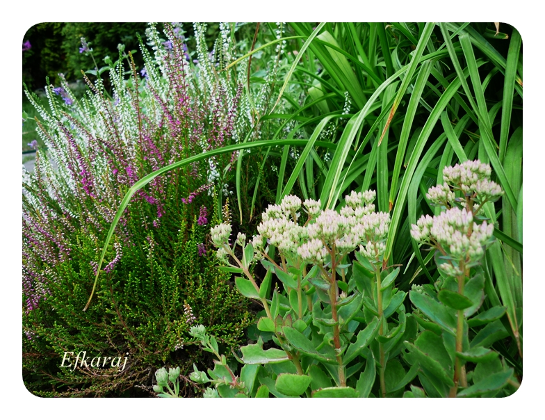 Sierpień - nie mam zdjęć całej rabatki, ale zaczynają kwitnąć rozchodniki i wrzosy, ponownie kwitnie kocimiętka, jeszcze jeżówki i floksy późniejsze i liliowce brunatno-czerwone.