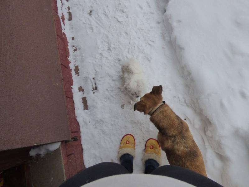 Iwonko Biały piesek w zimie to duży problem,wieczorem gdy idzie siusiu to zawsze ją szukam z latarką