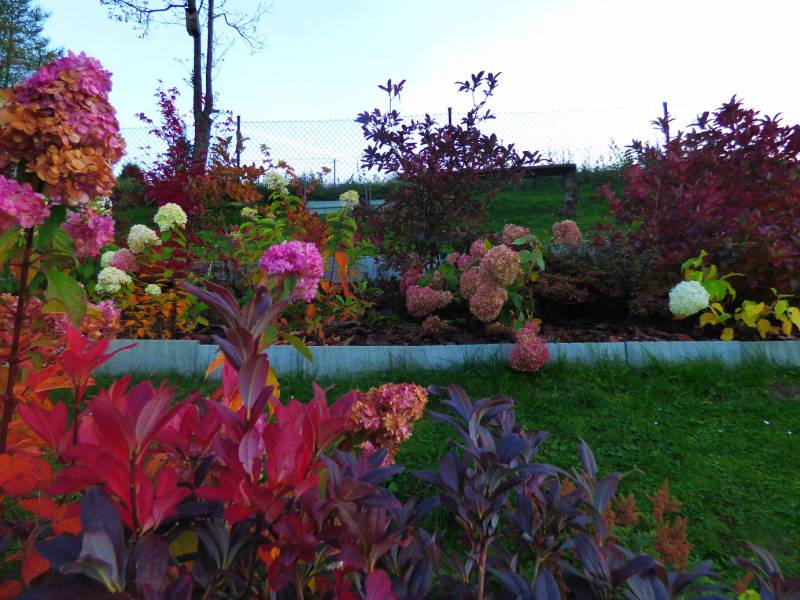 Rabata azaliowa co roku,jesienią mi zarastała trawa,więc zrodził się pomysł,aby nasadzić hortensje bukietowe,chociaż część kwiatów była w tym roku dokupiona,to te większe okazy spisały się na medal,u mnie klimat zimniejszy i niektóre zakwitły dopiero we wrześniu,ale i tak nacieszyłam się ich widokiem,kupiłam betonowe palisady,na podłoże dałam włókninę i nasypałam dużo kory,której naniosłam wiosną z korowania pniaków wielkich modrzewi.
