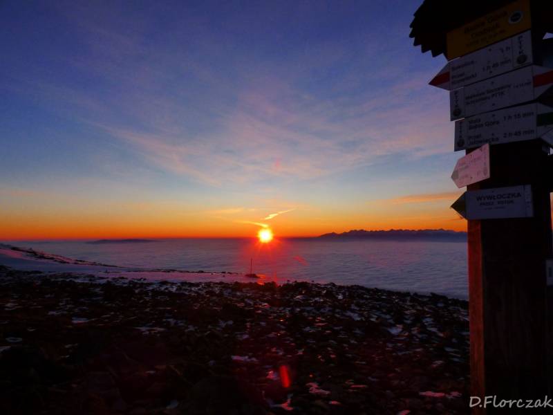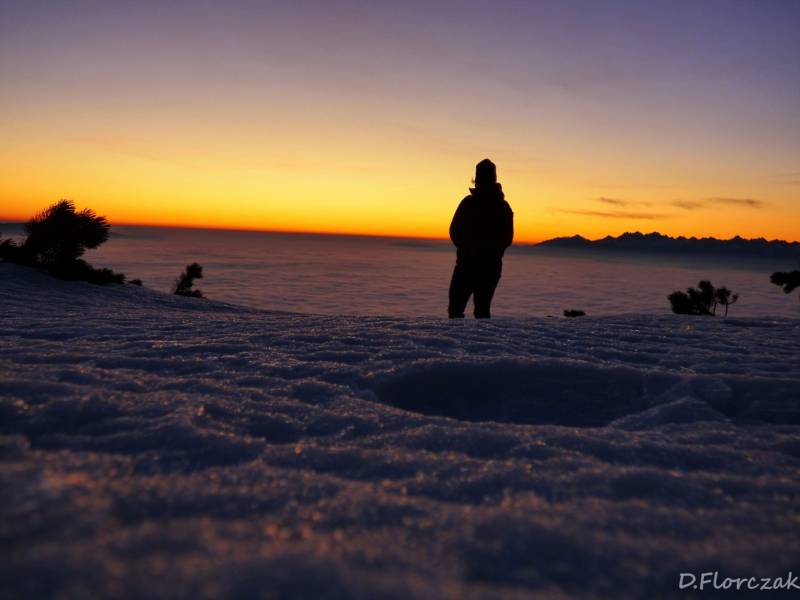 O 4,30 byłam na Krowiarkach i miałam 2h05 minut czasu do wschodu słońca.Na parkingu nie bylo ani jednego samochodu,znaczy to że na szlaku byłam tylko ja,podejście na Sokolicę jest najbardziej wymagajacym podejściem,zajmuje mi to zawsze 40 minut,albo mniej w zaleznosci od kondycji niestety tym razem szłam 43 minuty,szło mi się źle bo było mi za ciepło,stopnie niektóre były oblodzone,bo z drzew kapała woda i przy ziemi marzła,wyjezdżając z domu mieliśmy -2 st,a na Krowiarkach plus 2,zjawisko fenowe.Podejście wsród drzew widoków zadnych,tylko wielki księżyc oświetlał mi szlak,po wyjściu na Sokolicę las zostawilam za sobą i szłam w tunelu kosówki,stopnie były ze sniegui lodu,wyjeżdzone przez turystów z poprzedniego dnia.Widać było tylko bezchmurne niebo,księżyc gwiazdy,wylączyłam czołówkę bo zaczęło juz świtac,po drodze zawiesiło się kilka pajęczyn na mojej twarzy znakiem czego,jest to ze idę pierwsza na szczyt.Po dotarciu na Kępę moim oczom ukazuje się piękny widok budzącego się dnia,tatry na wyciagnięcie ręki i morze chmur,otaczajace cały Beskid Wyspowy i Orawę