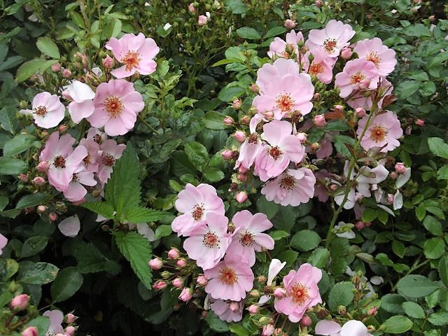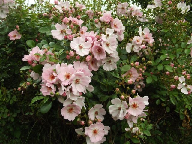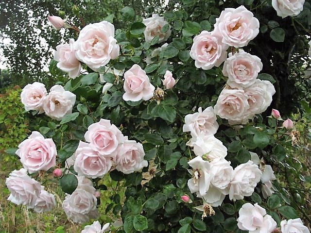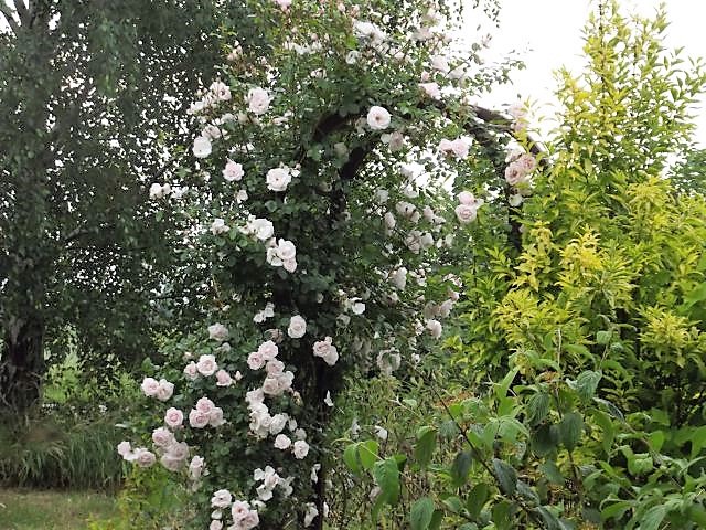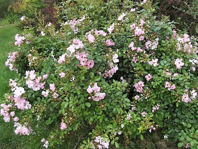 Betina, opisywałam na poprzedniej stronie niektóre z tych roślin. Na pergoli jest New Dawn, biały krzew to jaśminowiec Belle Etoile, róża za nim nn od lat wielu. Ta różowa panna róża to niby Sweet Haze, słabo kwitnie w tym roku albo dopiero rozkwitnie jak należy bo ma dużo pąków. Co roku ma taki moment, że jest jednym wielkim kwiatem wink-3