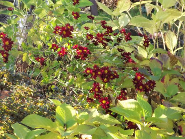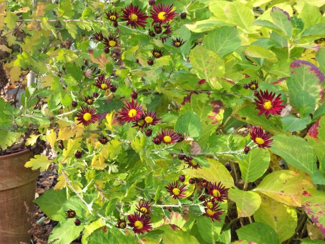 Wiesiu, te chryzantemy to takie cmentarne, przezimowane na werandzie, były rok temu mini kulką, a w tym roku mają wysokość około metra, bez skarlaczy, w pojemniku tak urosły, na zimę znowu je schowam bo są cudnej urody, a do tego kwitną bardzo późno i długo, nadal cieszą oczy.