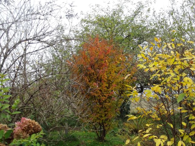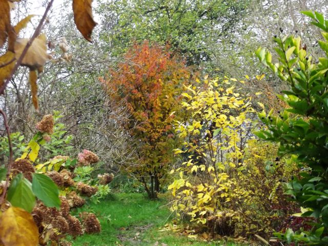A u nas jest w miarę dobra pogoda, dziś było bardzo słonecznie i przyjemnie. Skusiłam się na długi spacer po ogrodzie, chociaż wszędzie jest mokro i na zadeptanych ścieżkach spod trawy wygląda błoto bo wczoraj padał niewielki deszcz. Liści w ogrodzie coraz mniej, kolorów coraz mniej, ale jeszcze można się nacieszyć.