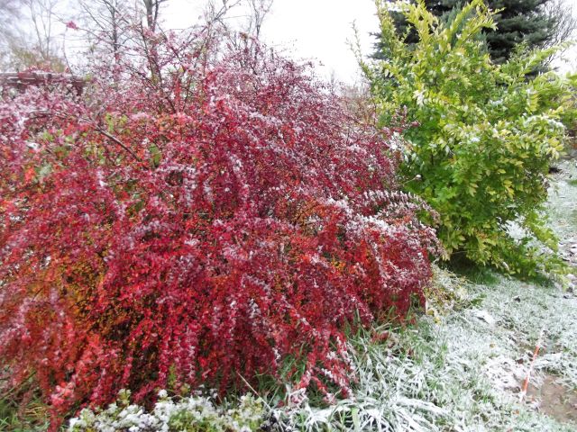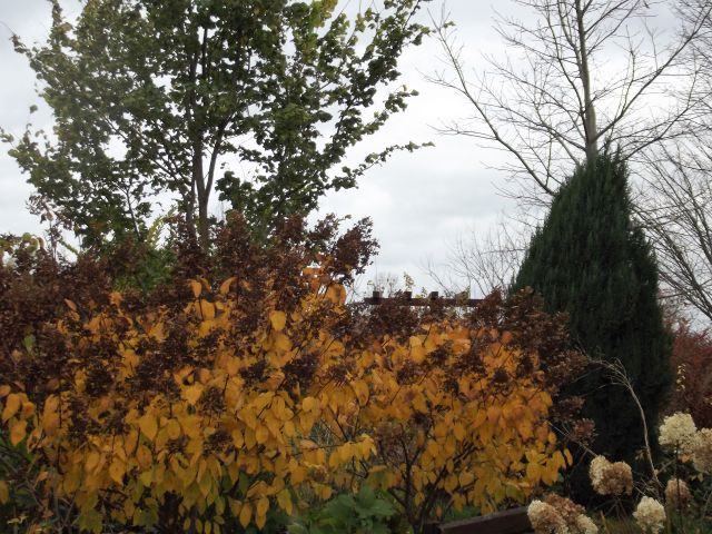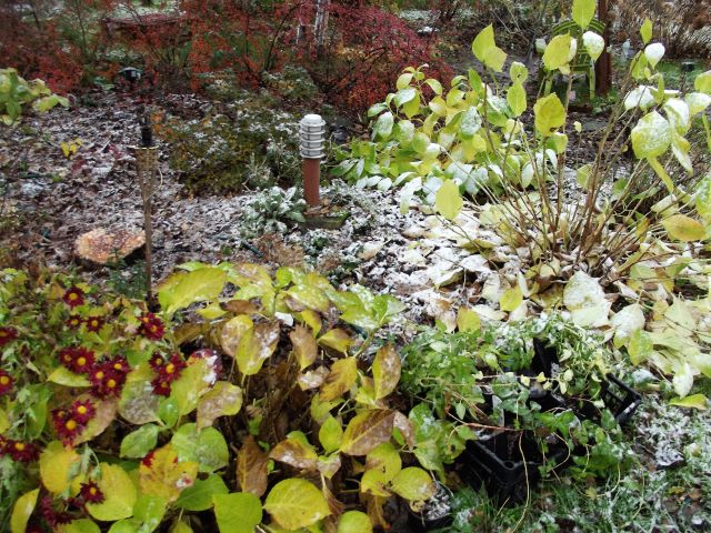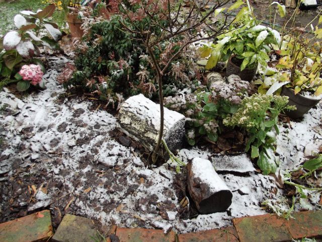 W ogrodzie jeszcze sporo liści na krzewach, ale już dziś rano spadł pierwszy śnieg. Śnieg mokry, nijaki, szybko się stopił i znowu mamy w ogrodzie błoto. Jest zimno i nieprzyjemnie. No ale w końcu mamy listopad więc upału raczej nie można się spodziewać :blink: