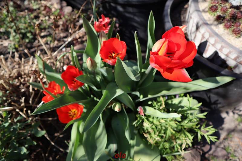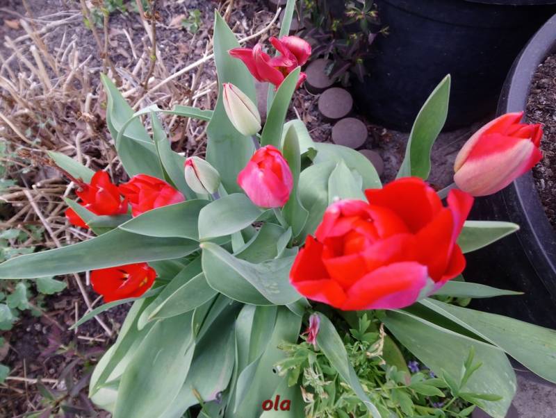 Jedne tulipany już są w kwiatach inne jeszcze w pakach