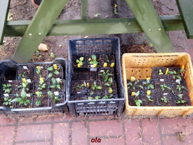 Żłobek , tegoroczny wysiew , po pikowaniu w lipcu jest też na świeżym powietrzu , na działeczce pod stołem :owady
