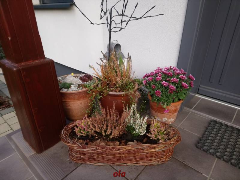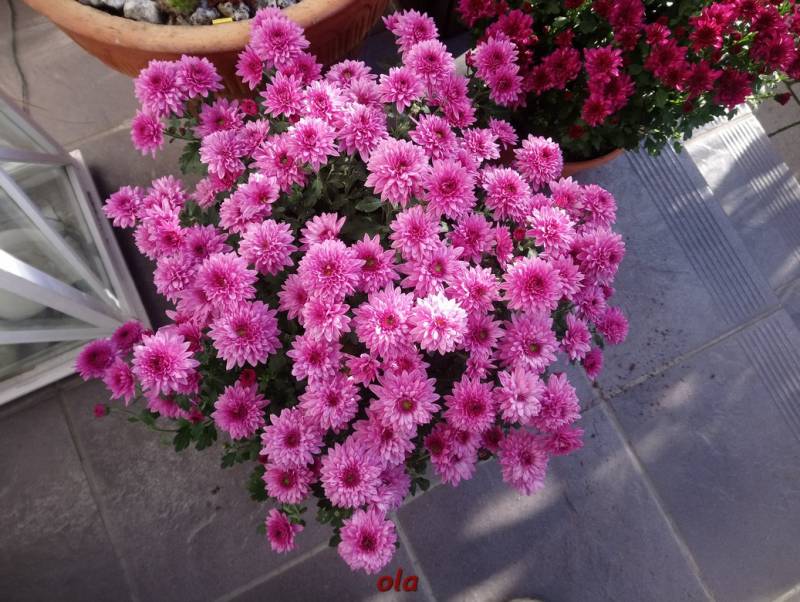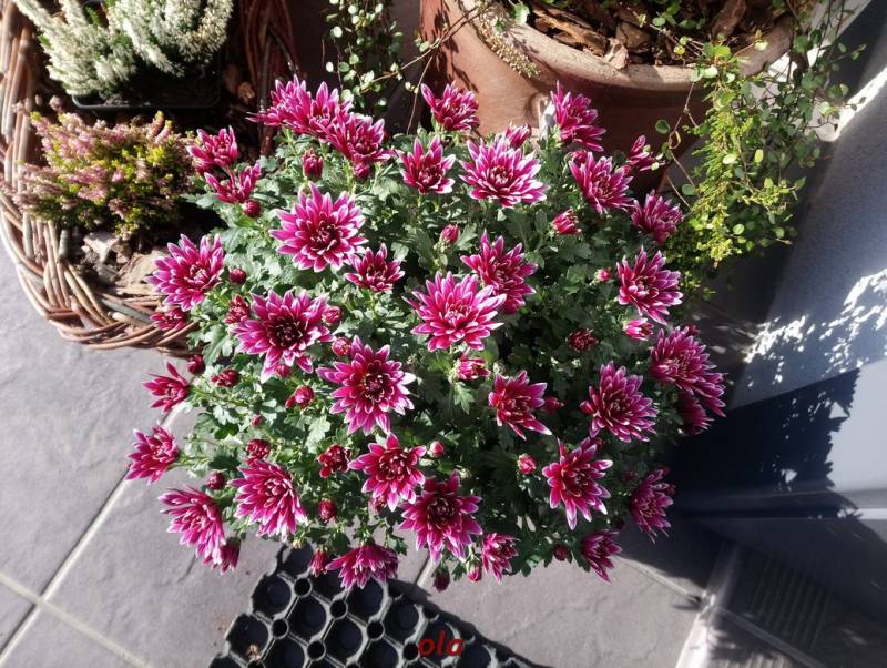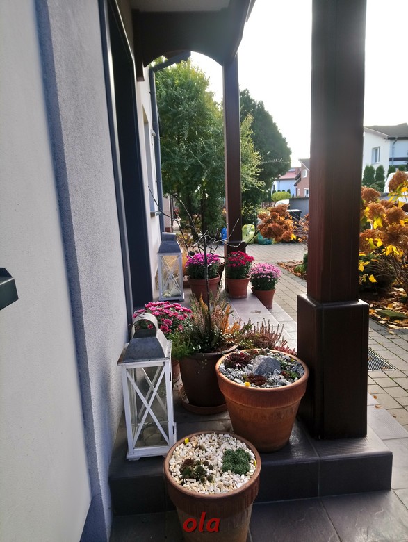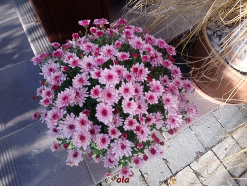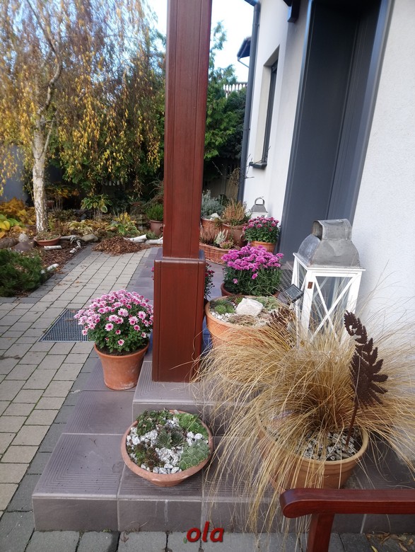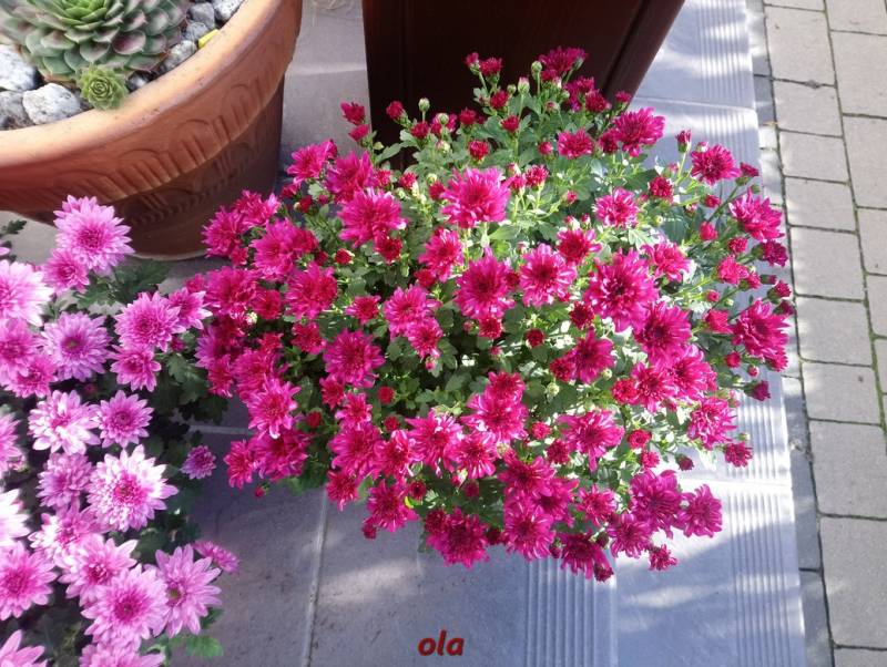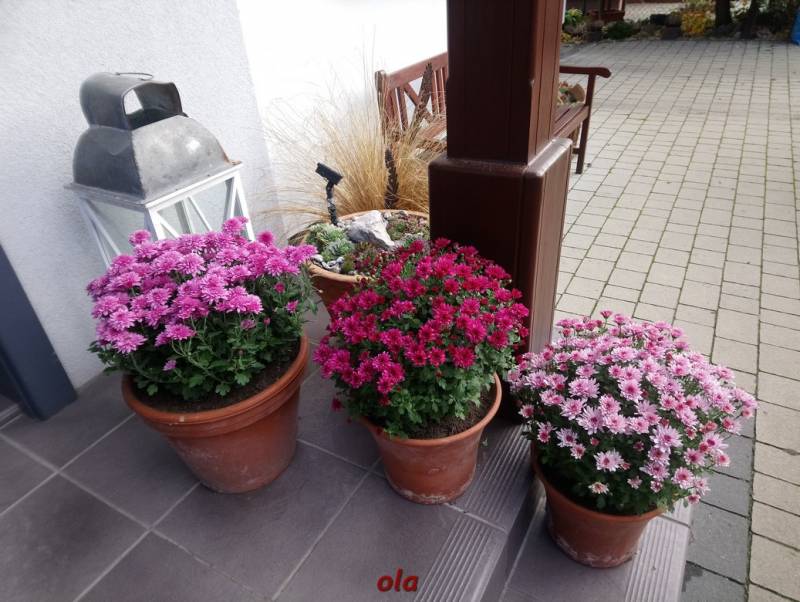 Zakupione chryzantemy , przesadziłam z ampelek do donic i już córce ozdabiają wejście do domu .