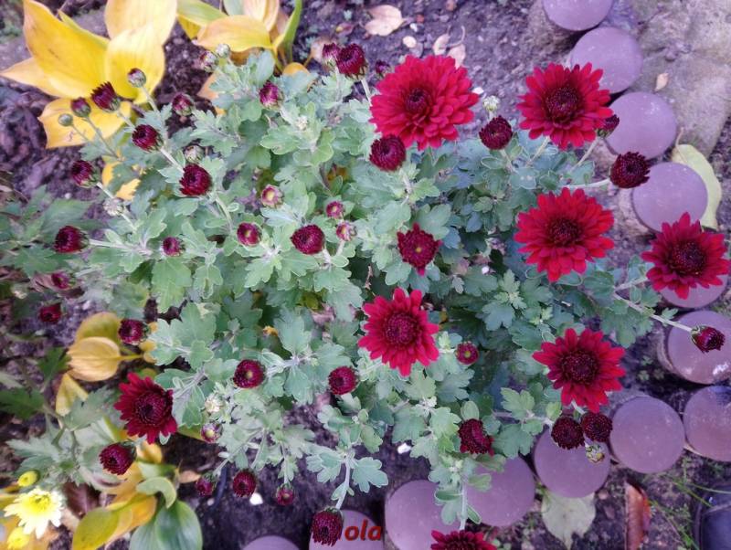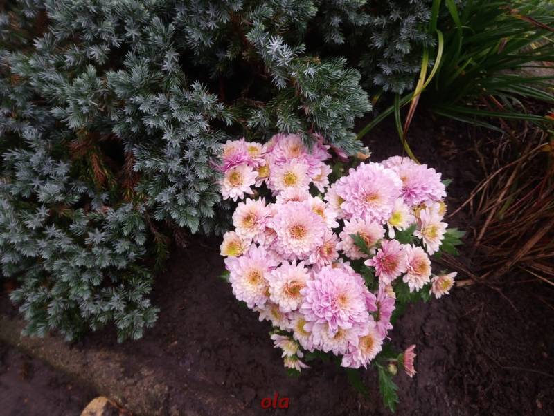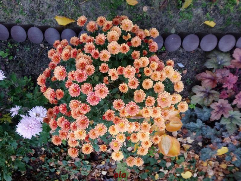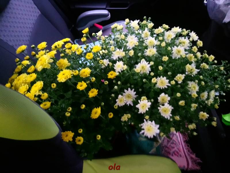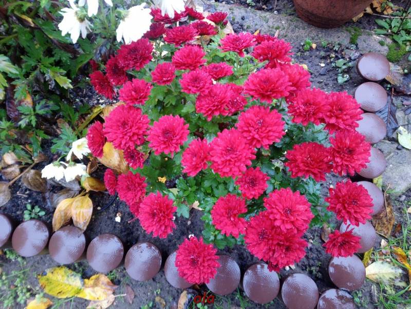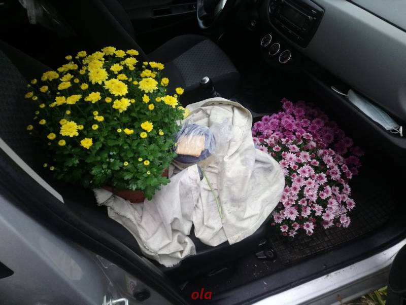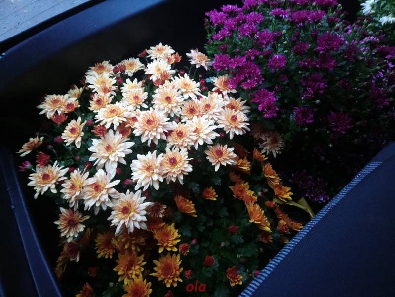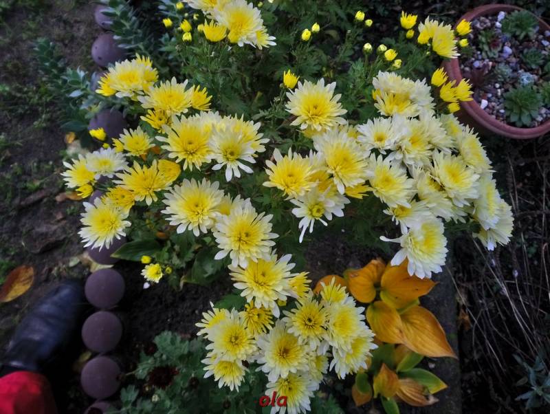 Zakupione chryzantemy , przesadziłam z ampelek do donic i już córce ozdabiają wejście do domu .
