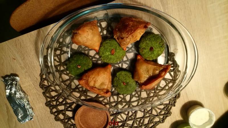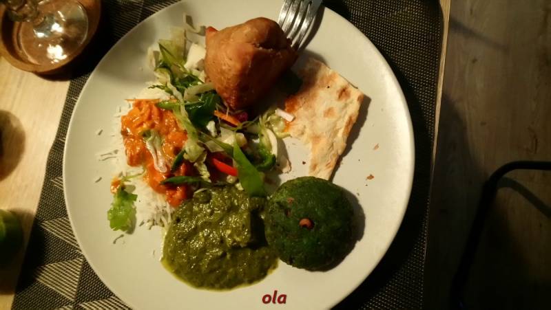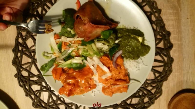 Bardzo smakowita była indyjska wyżerka , z dań na ciepło kurczak w sosie , sandacz w sosie , ser w szpinaku , kotleciki warzywne i pieczone nadziewane torebeczki , do tego ryż , podpłomyki + sosiki , surówka i sok z mango ....pity przez najmłodszego wnuka przez słomkę . Obiad był o 14:00 i w tym dniu już nikt nie miał ochoty na kolację .