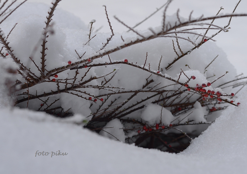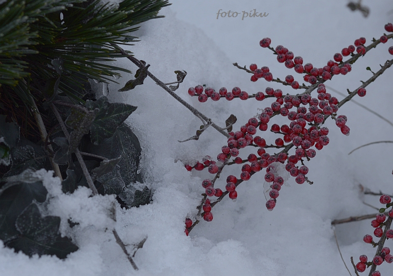 Czerwone koraliki na tle śniegu wyglądają przepięknie