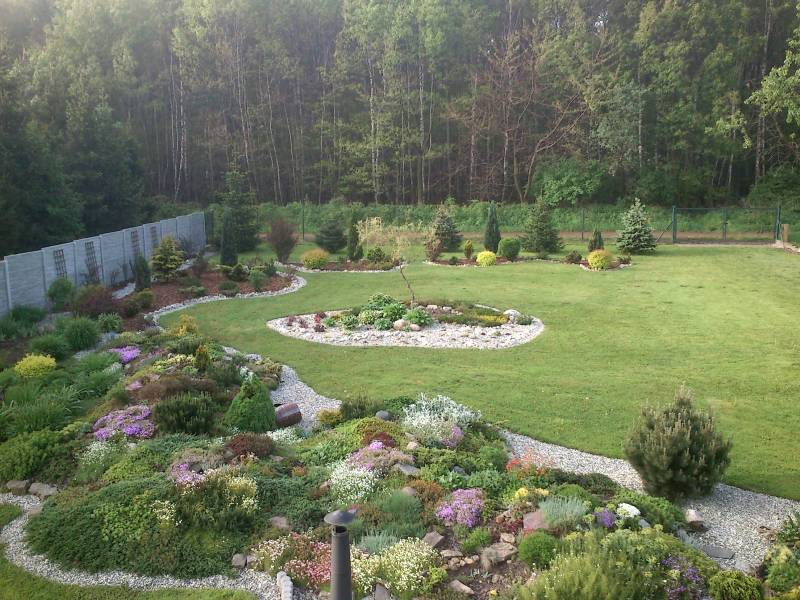 teraz raczej skalniak jest skarpą z niedużymi krzewami iglasto liściastymi, trochę bylin, wrzosy, wrzośce, niskie trawy... jest może bardziej zielono, ale spokojniej dla oka.