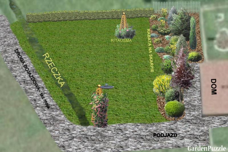Wygląda to mniej więcej tak: DOM, RABATA NA SKARPIE, ŁĄCZKA, STRUMYK... a ten na wiosnę lubi czasem wylać aż na łączkę... Może Wam przyjdzie coś sensownego do głowy? krecigl
