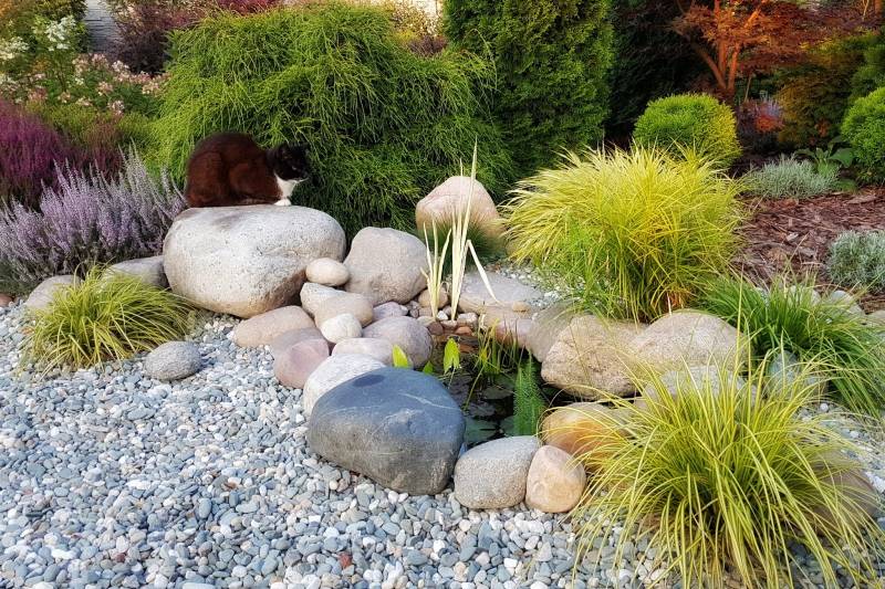 No i to mini, mini oczko o pojemności 250 litrów, więc służy ptakom, żabom i jaszczurkom. To zwykła wytłoczka z czarnego platiku. Forma umożliwiła dosypanie żwirku (żeby ukryć platik) i położenie kamieni w taki sposób aby zwierzaki mogły po nich swobodnie wyjść "na ląd". Pracy z nim niewiele, uzupełnić poziom wody, czasem wybrać ręką glony, woda jest czysta raczej dzięki roślinom i małej pompce na solar. Na razie się sprawdza