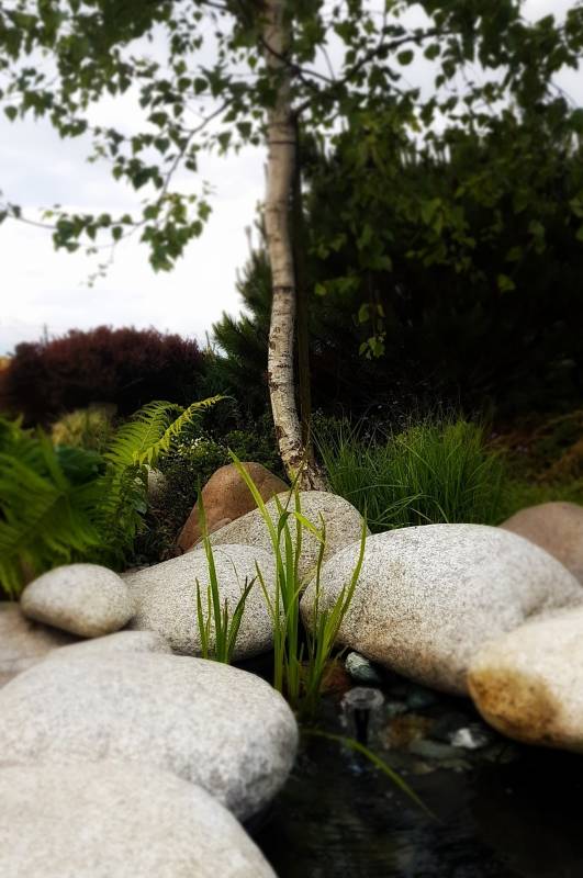 Miałam już NIC nie wymyślać i nie robić... no to sobie sprawiłam niespodziankę na poniedziałkowe popołudnie - 2 tony granitowych otoczaków. Kamień uwielbiam. Najbardziej polny albo właśnie otoczaki. Jakoś mi się komponują z tym moim zwyczajnym ogrodem, w którym nie ma żadnych "wypasionych" ozdób, murków itp. 2 tony to niby niewiele jak na kamień, a momentami czułam się jak wysłannik Greenpeace toczący wieloryby, tyle że kamienne i po żwirku. Większa część poszła na skarpę i na znowu przerobioną obwódkę oczka, a reszta rozwłóczona po ogrodzie, to tu, to tam.