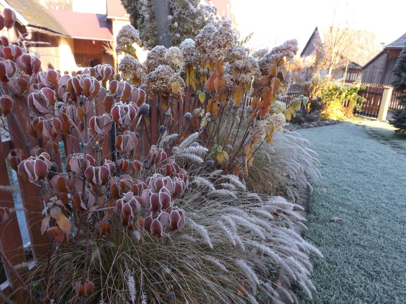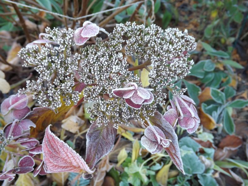 Dzisiaj było tak samo jak wczoraj -6 rano a potem śliczne słonko i błękitne niebo.Okryłam tylko hortensję Santiago i dwie kosmate ,reszta musi radzić sobie sama .
