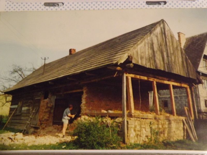 Zdjęcia trochę niewyraźne ale nie mogłam znaleźć płytek więc zrobiłam zdjęcia fotek które mam w albumie.Jak pisałam nie mieliśmy zbyt wiele pieniędzy więc trzeba było sobie jakoś radzić,tu gdzie część drewniana to było mieszkalne a murowana część to była stajnia i pomieszczenia gospodarcze,mury były z cegły więc powolutku obijaliśmy cegiełka po cegiełce z zaprawy żeby użyć w nowe mury.Okazało się że cała wiąźba dachowa oprócz jednaj belki jest zdrowa więc żeby obniżyć koszty plany domu zrobiliśmy tak jak był stary dom,żeby nie naruszyć dachu musieliśmy dom rozbierać częściowo,pierwsze murowana połowa,podpieranie dachu,wycinanie dwóch belek żeby można było wlać fundamenty a wszystko robiliśmy sami z pomocą ojców a dzieciaki były u mamuśki.Fundamenty pod belkami musieliśmy wybierać chwilami nawet saperką bo inaczej się nie dało.