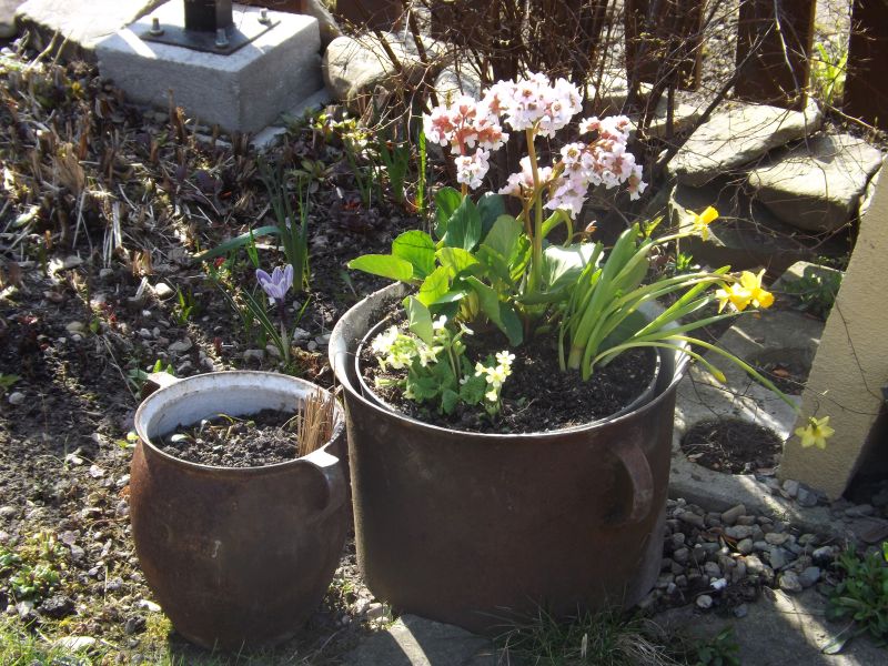 Wreszcie miałam słoneczko i temperatura nawet koło 10 st. przyszły lilie z Lilipolu -ładne zdrowe i nawet gratiski dostałam a oprócz tego do rąk mi dzisiaj wpadła bergenia ale oczywiście bez nazwy.Obsadziłam moje żeliwne garnki koło grilla a jak przekwitną to planuję tam kupić miniaturowe róże.