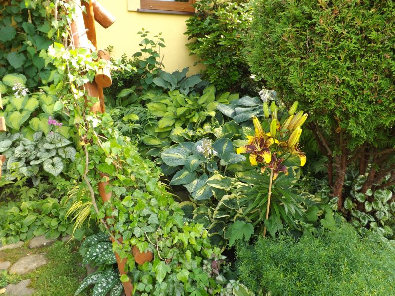 Aniu bo tam rośnie z nią powojnik wielkokwiatowy który kwitł na wiosnę nie wiem dlaczego mu nie zrobiłam fotki.To jeszcze dla Ciebie kilka z hostowego zakątka