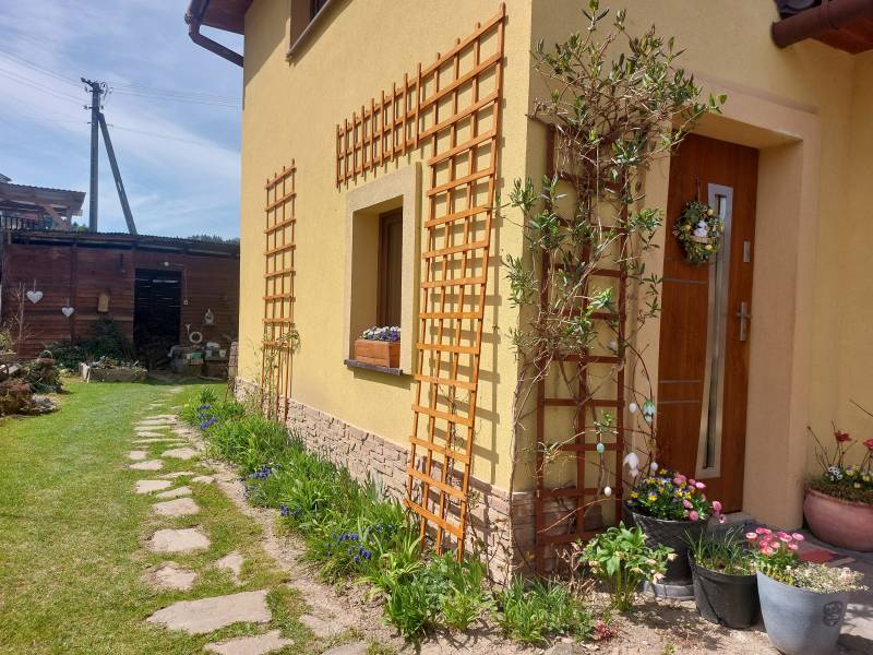Potrek zrobił mi kratki pod pnącza i juz zamontowane teraz tylko czekam na efekty na pierwszej ma się piąć kupiona w zeszłym roku akebia bo od dawna mi sie marzyła i wymyśliłam gdzie ją poisadzić a przy drugiej są dwa powojniki i róża