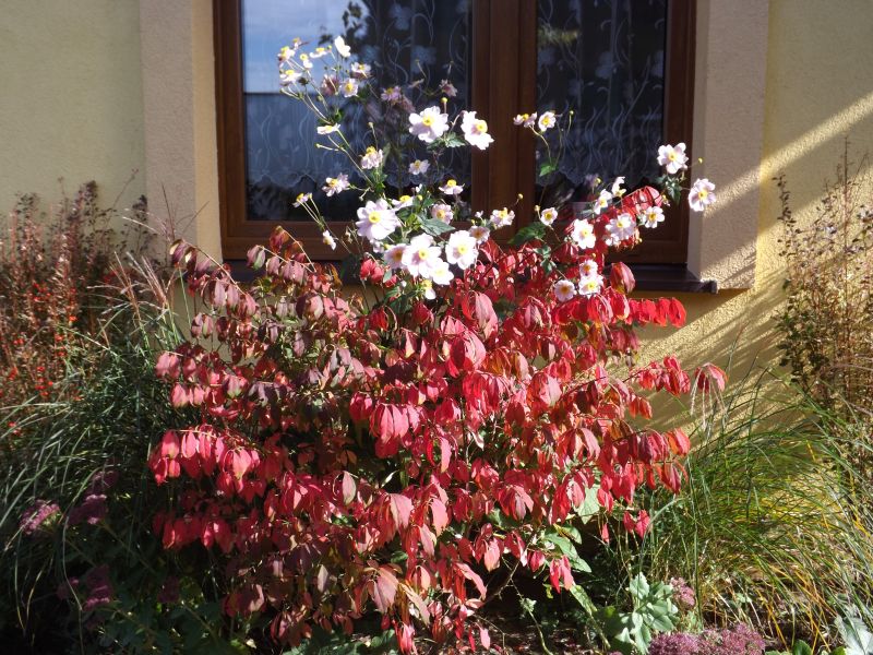 Ewuś widać już bardzo bo niektóre byliny i hosty musiałam pościnać ale część się jeszcze ładnie trzyma a i dla Ciebie fotka trzmieliny z dnia na dzień piękniejszej i jeszcze trzyma listki