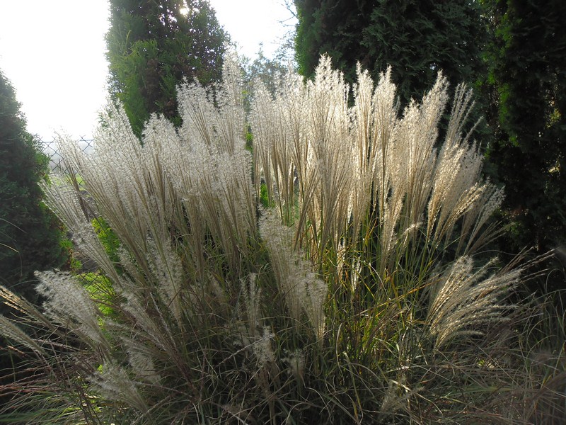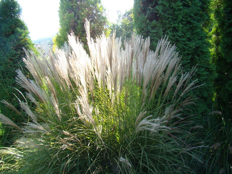 Za cyprysikiem rośnie kruszyna Fine Line.