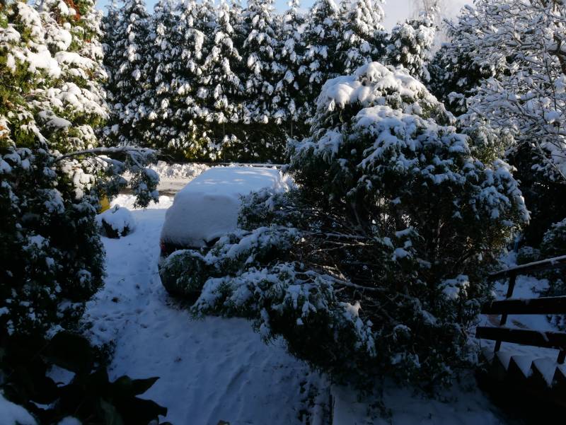 No cóż zima zaskoczyła drogowców ale i mnie również ....takiej śnieżycy nie widziałam jak żyję zdziwko zdziwko zdziwko ,piękne to zjawisko i ale i cholernie niebezpieczne ,nawet przez okno strach było patrzeć...na szczęście strat wielkich chyba nie ma tylko poprzyginane tuje na razie przegląd był z okna zaraz idę na obchód .A dzisiaj słoneczko i na razie -2