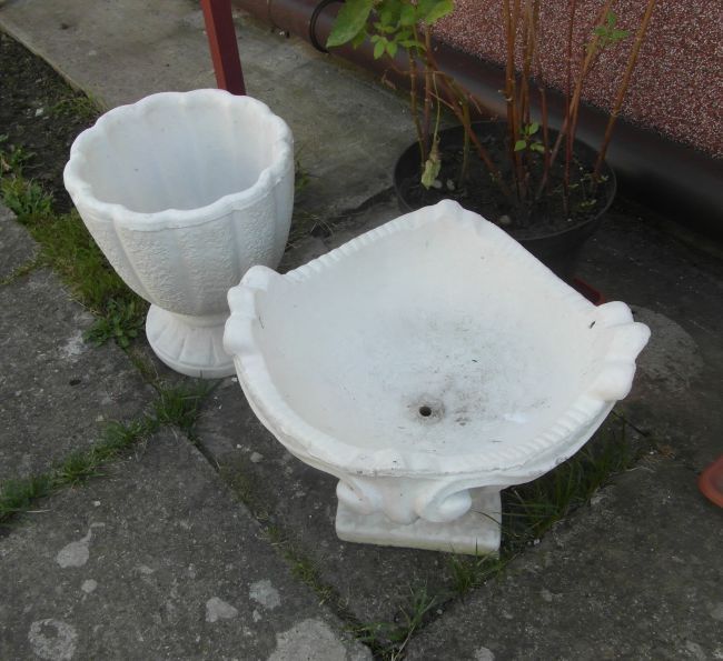W znajomym centrum ogrodniczym kupiłam przecenione z okazji kończącego sie sezonu diw duże betonowe donice i poszłam jeszcze raz- wzięłam malutkie poidełko i nieduży koszyczek. Figurki na ogrodzie to mój trzeci fioł- drugim są róże chińskie. wink-3 Moje chińszczaki odmładzam- ucięłam tylko czubki i ukorzeniam- stare, zdrewniałe pocięłam na kompost... Sporo prac na ogrodzie pchnęłam do przodu, ale jeszcze jest co robić. Póki pogoda sprzyja. Wykopane z donic galtonie, kanny, dalie / które kiepsko tego roku się zachowały- za rok jeszcze raz je wsadzę- może będzie lepiej/ , ismeny, inkarwille, gloriozę .. . Mieczyki wykopałam -też nie miałam z nich pociechy - ładsne bulwy- synowa chce to jej dam... Różyczki jakieś tam rozkwitają- jeszcze mam trochę przekwitłych do obciecia- nie zostawiam na nasiona by je przygotowac do zimy...