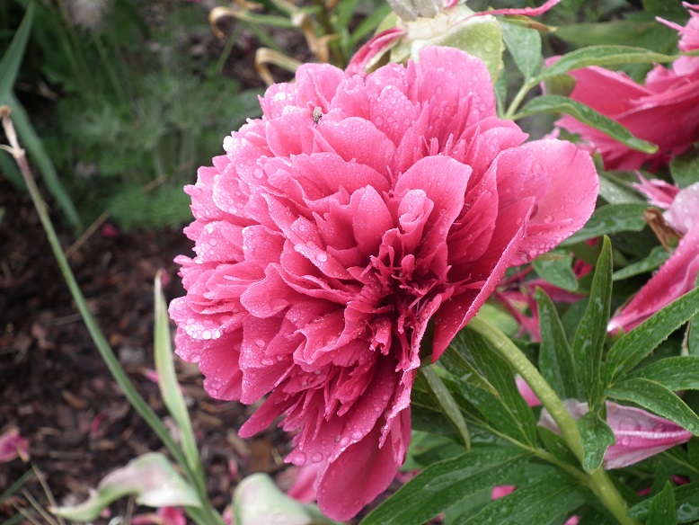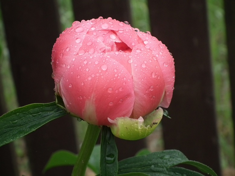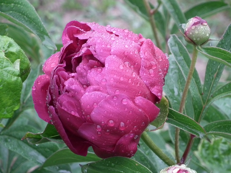 piwonia Coral Charm w tym roku znów ma tylko dwa pędy ale za to będą dwa kwiaty,a to pierwszy duży pąk