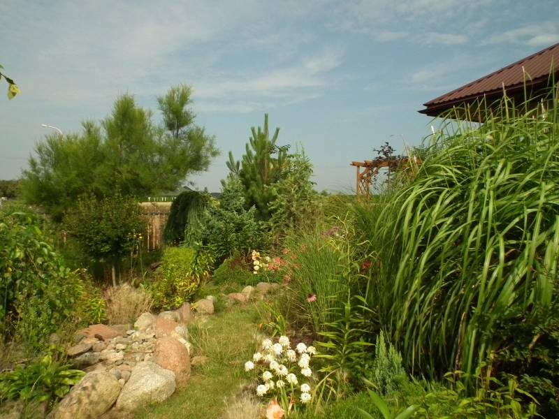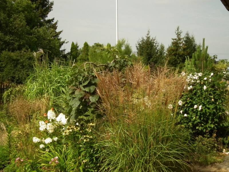A to jest rabata na której Memory miał robić za tło dla innych traw, a tu proso Heavy Metal przerosło miskanta( nie zwracajcie uwagi na uschniętego klona do wymiany wiosną bo za bardzo chciałam go uchronić przed zjedzeniem mu liści przez chrabąszcze to załatwiłam go na amen dobrze że tylko jego inne drzewka jakoś sobie poradziły)