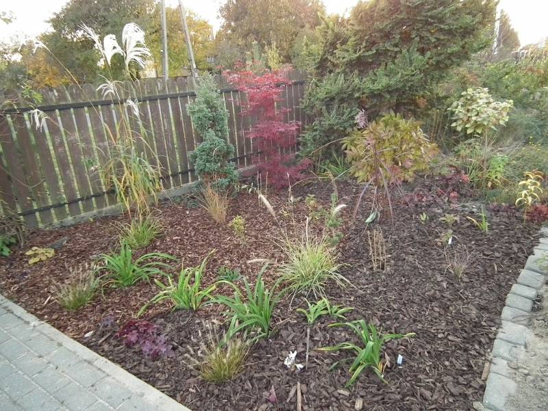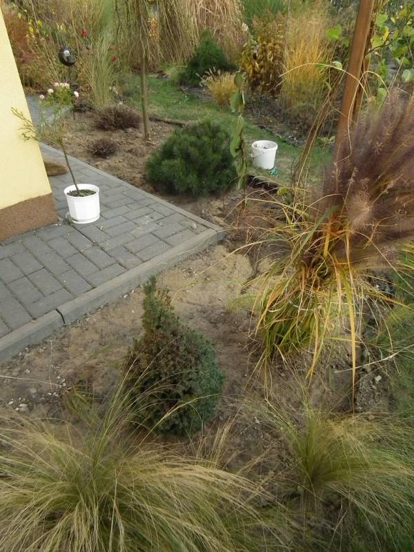 dodam jeszcze że przy ściąganiu maty nie obyło się bez strat musiała wykopać sporą kępę lawendy bo poprostu się z nią zrosła i nie było innego wyjścia. Narazie nic nowego na niej nie sadziłam poza ukorzenionym patykiem hortensji , którą chciałabym poprowadzić na pniu, teraz przez zimę muszę pomyśleć co tam ostatecznie będzie rosło. Napewno zostanie karagana, miskant Morning light, sosenka i rozplenica Moudry nad lawendami się zastanowię ale mam na to sporo czasu .