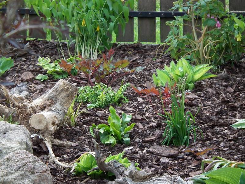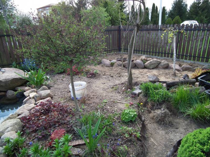 W rogu powstała delikatnie podniesiona rabata, na którą cień będzie dawała katalpa jeśli tylko przeżyje przesadzanie i będzie rosła