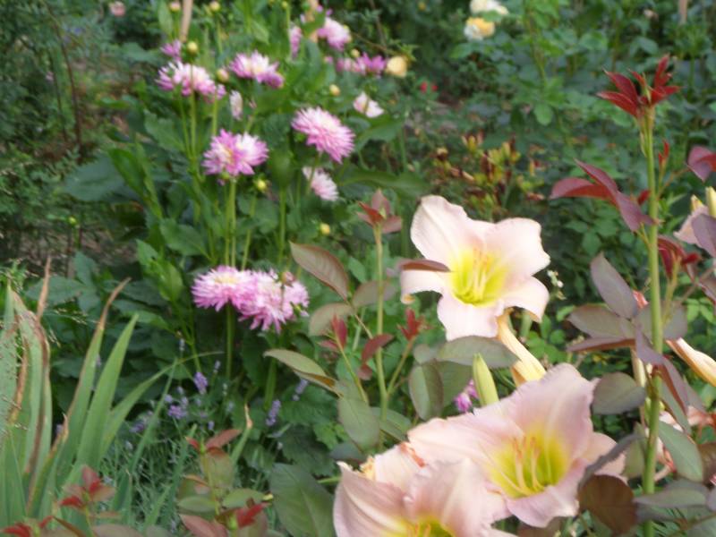 Olgo, bajecznie u Ciebie, tak masa kwiatów, wszystko ślicznie przeplata się, masz moja ulubiona dalię, taką wysoką, różową, pełną, bardzo ją lubię.