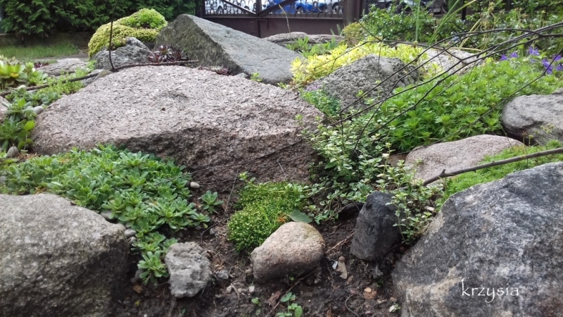 Jesienią wydostaliśmy wszystkie kamienie uważając na rojniki i mech wink-3 , dosypaliśmy ziemi, ułożyliśmy kamyczki z powrotem i zaczęłam zasiedlać szczeliny między nimi.