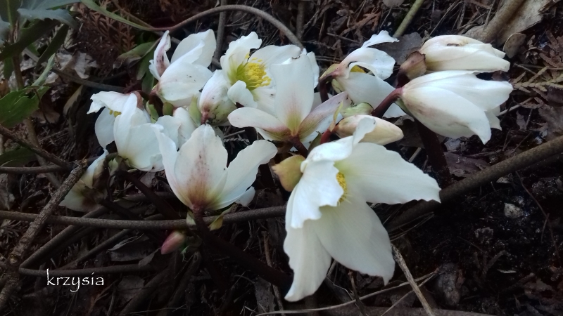 , oznaki wiosny pojawiły się i u mnie, krokusy, iryski i cebulice jeszcze w stanie szczypiorków, zakwitły ciemierniki białe i przebiśniegi, które trzeci już rok po przesadzeniu wegetują