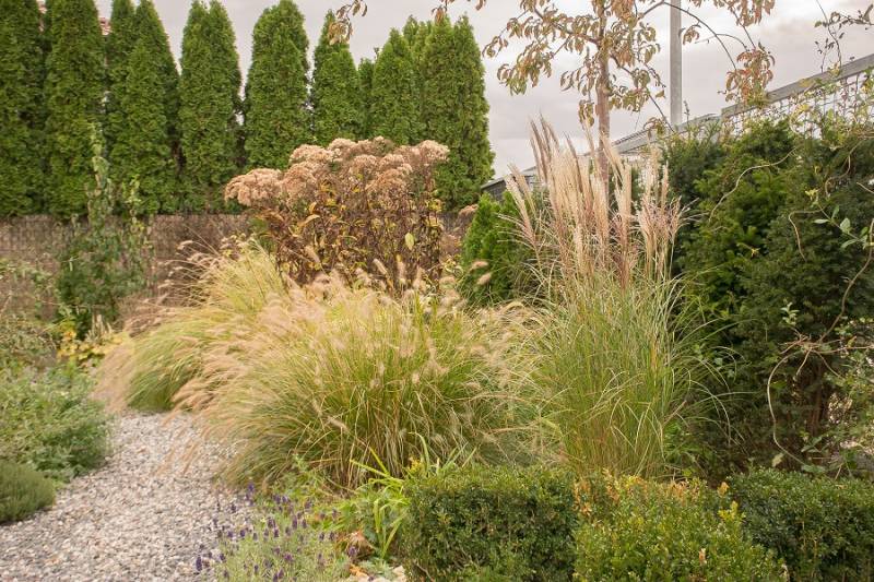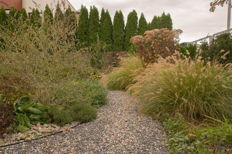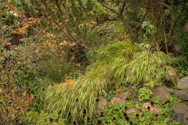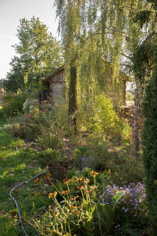 Wokół sosny powstała lekko podwyższona półcienista rabata. Tu parzydło paprocie, rodgersje, saruma, epimedium. Może odżyje rodek smirnovi, który jeszcze nigdy nie kwitł.