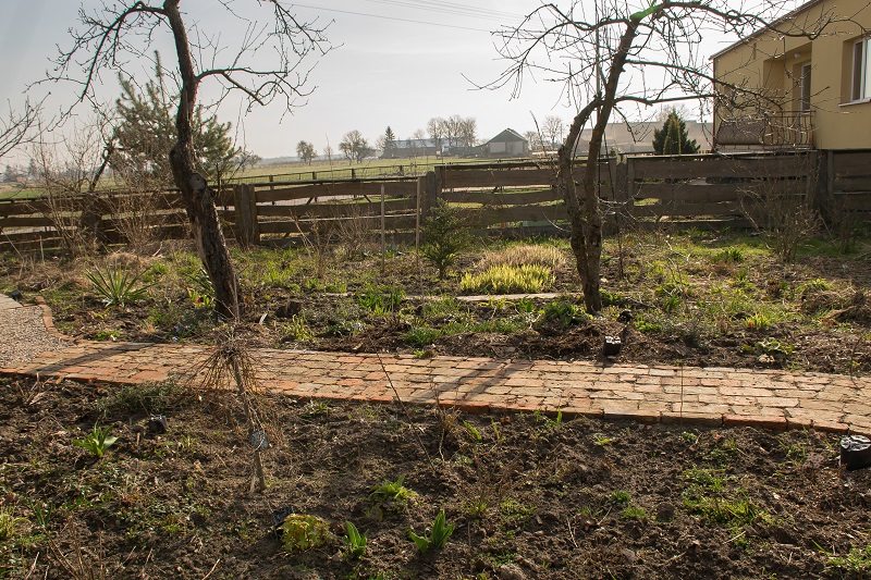 W ubiegłym roku w wiejskim pojawiły się ścieżki. Wykorzystaliśmy kupiona kiedyś cegłę rozbiórkową z carskich fortów. Przewiezienie kilku palet z Warszawy na wiochę to było niezłe zadanie logistyczne. Poza tym żwir i odzyskowe płyty chodnikowe.