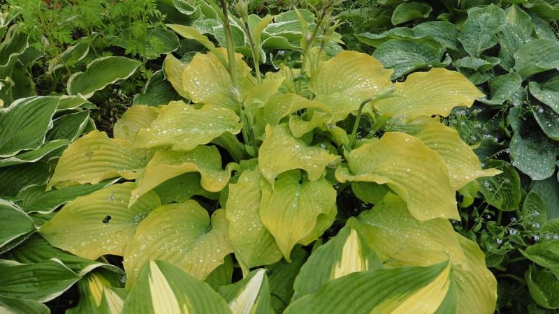 Wiele host (dorosłych, dobrze ukorzenionych) na wilgotnej glebie daje radę na słonecznych stanowiskach.