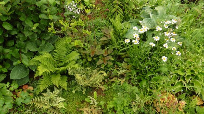Teraz tylko od czasu do czasu go przestawiam. Ogród jest więc zielony, skutków suszy nie widać. Hosty są wielkie, pierwsze dalie kwitną