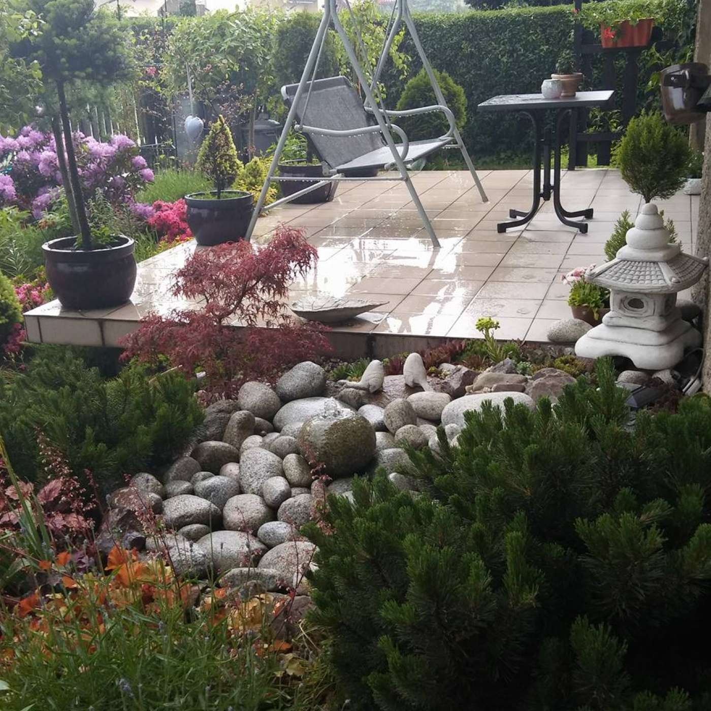 Twój azyl bardzo mi się podoba - są kamyki, są rośliny skalne i trochę 'japońszczyzny', a do tego fajnie to wszystko razem utkane. Miło na takim tarasiku spędzić czas w takich okolicznościach przyrody. :)