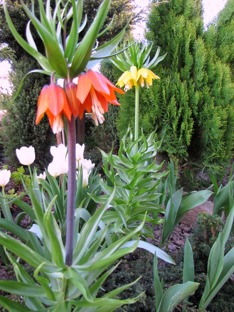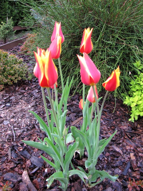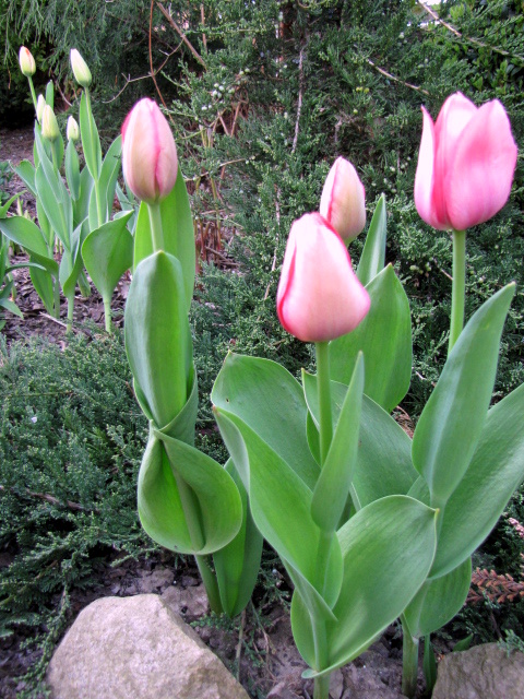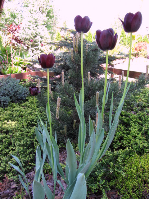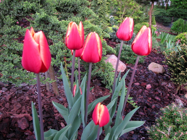 Super wyglądają tulipany wśród iglaków