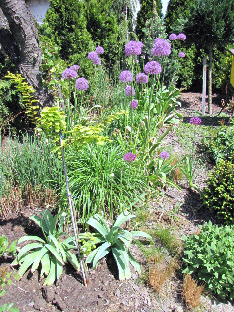 Prawie w ogóle nie mam bylin, kolor w ogrodzie to drzewa i krzewy. Ale zanim prym przejmą przyrosty na iglakach parę zestawień, które już zdobią