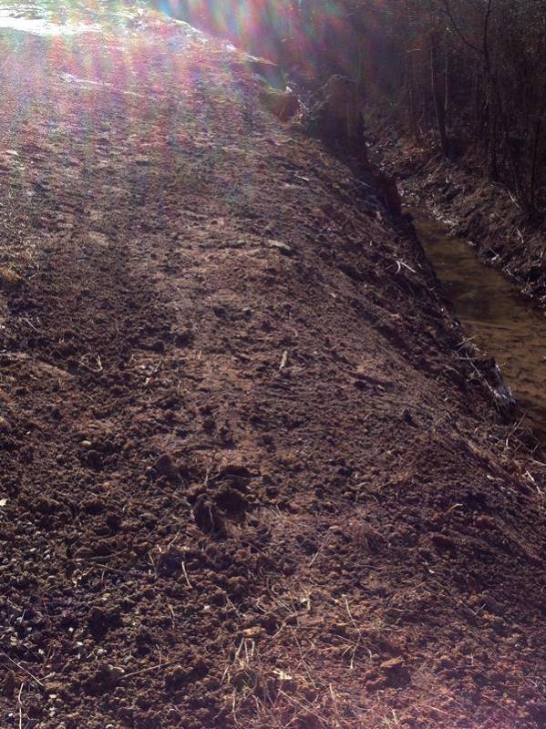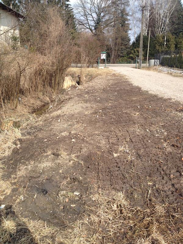 Dziewczyny wywołałyście chyba sprawę obsadzenia kanaliku swoimi pytaniami. W poniedziałek na naszą działkę wkroczyła ekipa w poszukiwaniu rury odwadniającej równoległą drogę. Rury nie znaleziono, pewnie została zniszczona w trakcie robienia przyłączy lub pobliskiej budowy ale za to przekopano mi 10 metrów brzegu. Przy okazji mili panowie wyrównali trochę bieg strumyka i wyrównali brzeg.