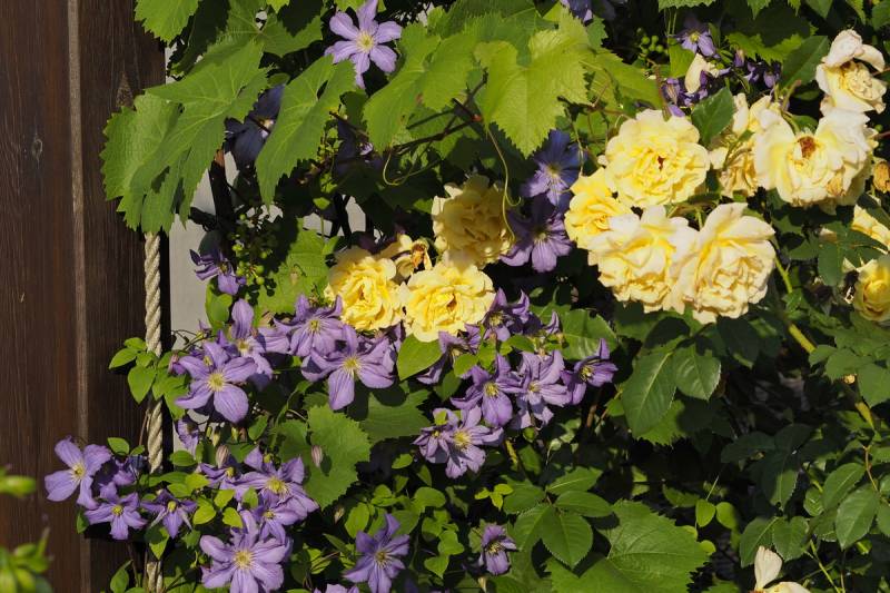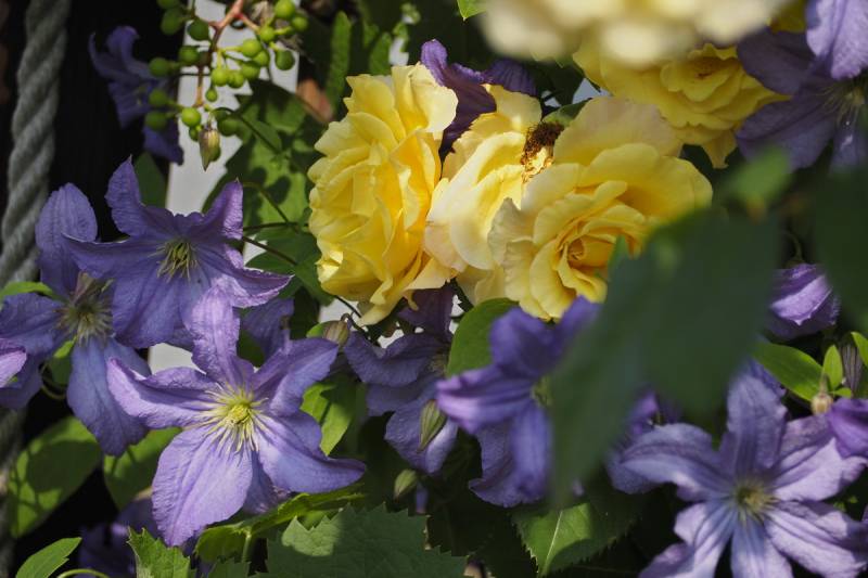 Kolejne przepiękne zestawienie :) żółta róża z fioletowym powojnikiem. clap