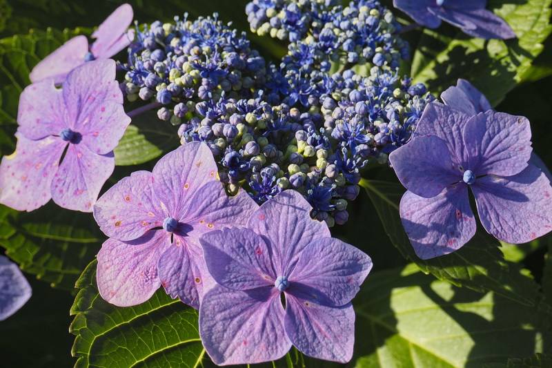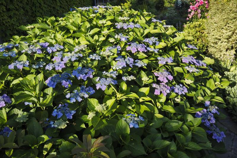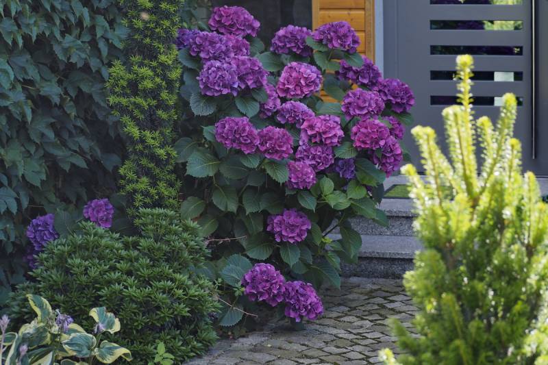 hortensja Masja rośnie przy wejściu do domu, w kącie gdzie słońce nie dociera, no może przez kilka minut