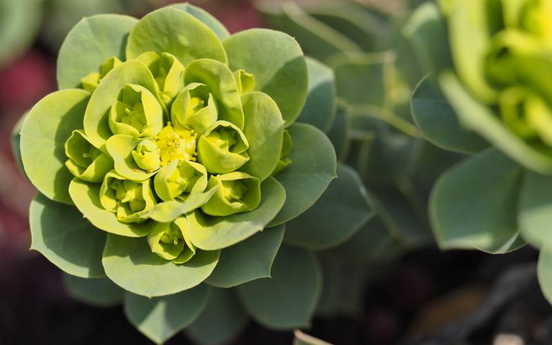 ... a nawet wilczomlecz mirtowaty. Jedna z moich licznych samosiejek, ten akurat postanowił wyrosnąć w żwirku okalającym dom. Jest gigantyczny