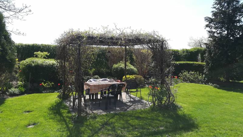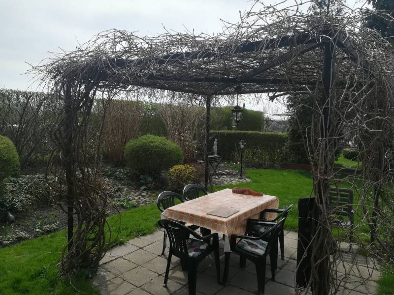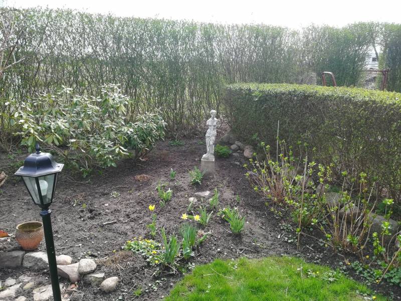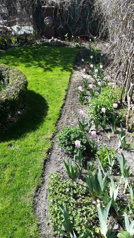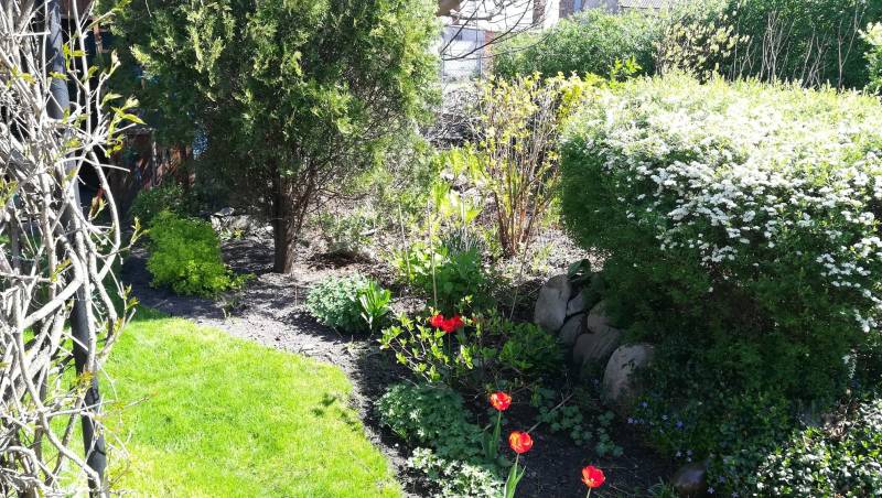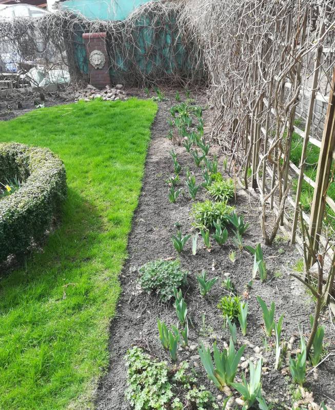 Chyba przymrozek podniszczył mi barwinka. Ni nic, odrośnie. Generalnie jeszcze ubogo. Zasadnicza zmiana przychodzi wraz z rozwinięciem się liści winobluszczu.